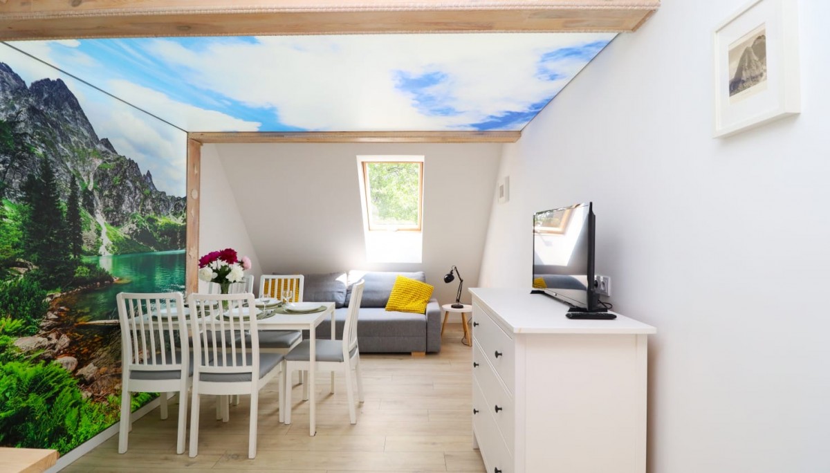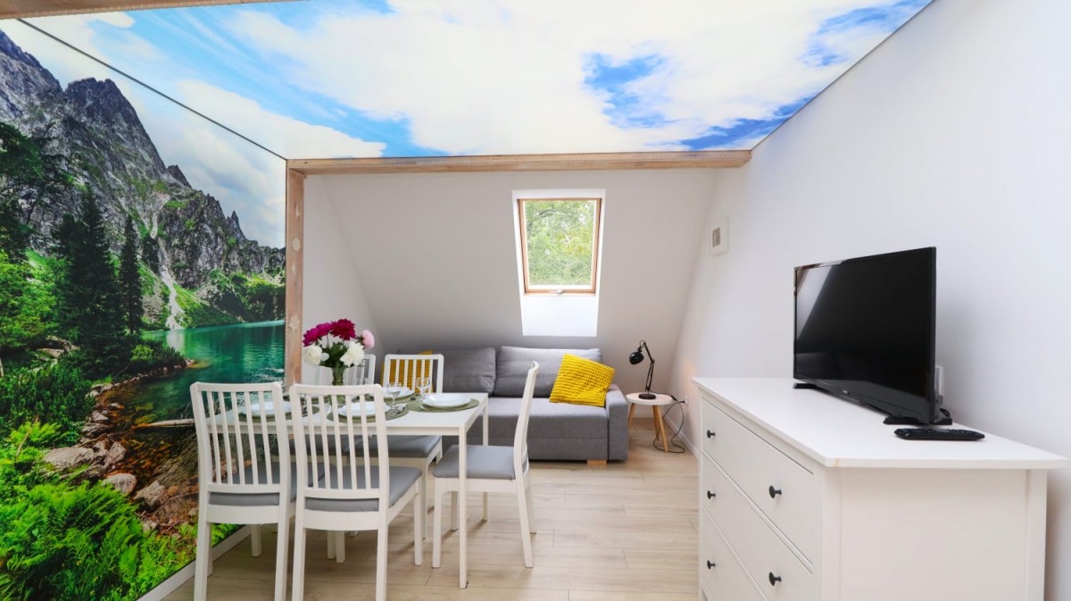 Apartament zlokalizowany jest w zabytkowym budynku Pałacu Tatrzańskim mieszczącym się w malowniczej miejscowości Bukowina Tatrzańska na Wierchu Głodowskim, z którego okien rozpościera się widok na piękny górskie łąki oraz lasy. To miejsce, w którym każdy Gość znajdzie coś dla siebie, aby mile i aktywnie spędzić wolny czas. W pobliżu znajduje się przystanek autobusowy, ośrodek zdrowia, apteka, sklepy spożywcze oraz karczmy